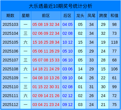 其中开出龙头号码为03,凤尾号码为24,跨度数据为21,和值数据为75;后区号码开出09、12,属于奇数+偶数、大数+大数组合号码。 最近10期大乐透数据统计表 ![]() 龙头分析:在最近10期奖号中,龙头号码有6期开极端数,4期开出偶数。上一期龙头号码开极端数03,较前期点位飞腾1点,本期预测龙头点位抓平,看好开出03。 凤尾分析:在最近10期奖号中,凤尾号码有4期开极端数,6期开出偶数。上一期凤尾号码开出偶数24,较前期点位下落2点,本期预测凤尾点位飞腾11点,看好开出35。 跨度分析(小跨度4-13,中跨度14-23,大跨度24-34):在最近10期奖号数据中,开出6次大跨,4次中跨,0次小跨。上期奖号跨度为21属于中跨,本期预测跨度为32,属于大跨。 和值分析(小和值15-64,中庸值65-114,大和值115-165):在最近10期奖号数据中,开出1次大和值,8次中庸值,1次小和值。上期奖号和值为75属于中庸值,本期预测和值为82,属于中庸值。 后辞别析:在最近10期奖号数据中,后区号码的奇偶比为5:15,大小比为11:9。最近5期分别开出后一号码:03、09、02、02、09,平均值为5.00,后二号码:06、10、08、12、12,平均值为9.60,本期预测开出的后一号码会大于平均值,看好开出06,后二号码会大于平均值,看好开出10。 大乐透第2025113期推选: 大乐透15+5大复式:01,03,05,06,12,15,16,20,24,26,28,29,33,34,35+01,04,05,06,10 大乐透9+3小复式:01,03,05,06,12,20,24,33,35+05,06,10 大乐透5+2推选:03,05,06,33,35+06,10 [扫码下载app河南中联圣泰起重机械有限公司,中过数字彩1千万以上的众人王人在这儿!] ![]() |