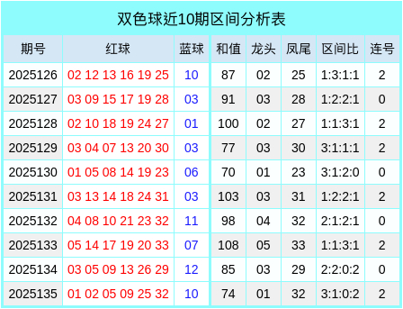 当期红球号码大小比为2:4,三区比为4:0:2,奇偶比为4:2,当期红球开出1组连号01,02,开出2枚重号05,09。蓝球则是开出格局为【大偶】的号码10。