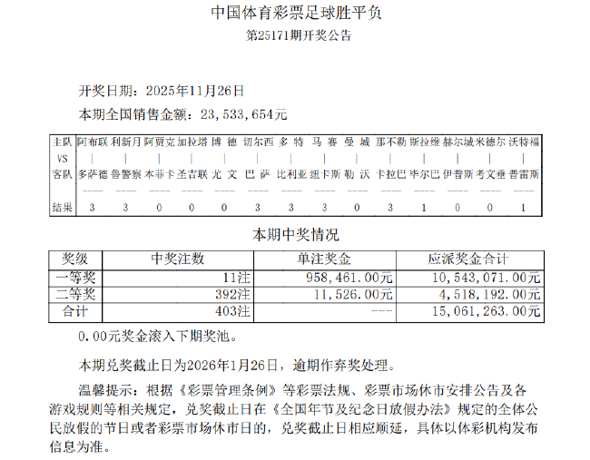 北京时分11月26日,输赢彩第25172期开奖效能揭晓。本期14场1等开出11注,单注奖金95.8万。14场2等开出392注,单注奖金11526元。任九开出1558注,单注奖金8306元。本期14场销量为23,533,654元,任九投注总数为20,221,674元。