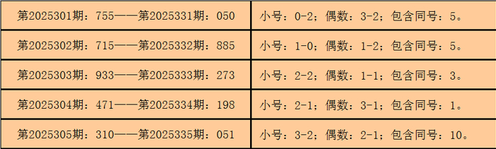 统计3D历史上已开出的奖号发现,在纠合5期开奖号码中:3D在第2025301期-第2025305期分散开出奖号:755-715-933-471-310。