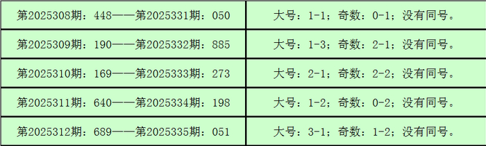 是以,3D第2025306期开出奖号:697,其大小比为3:0,奇偶比为2:1,012路比为2:1:0,与3D第2025336期奖号可能有同号。