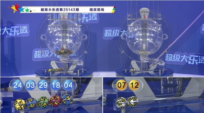 上期开奖:大乐透第2025143期开奖号码为:03、04、18、24、29+07、12。