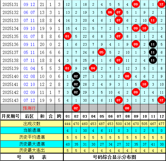 其中,号码奇偶比为51:49,大小比为45:55,012路比为31:38:31,本期前区龙头号码参考01。