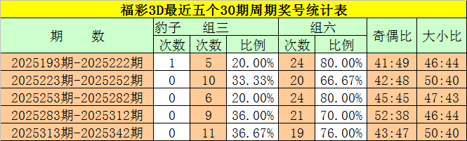 在最近一个30期周期内(第2025313期-第2025342期),豹子奖号莫得出现,组三奖号开出了11次,所占比例为44%,组六奖号共出现19期,开出比例为76%,上期出现组六号码之后,本期看好组六号码不竭开出。