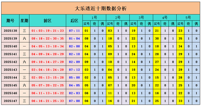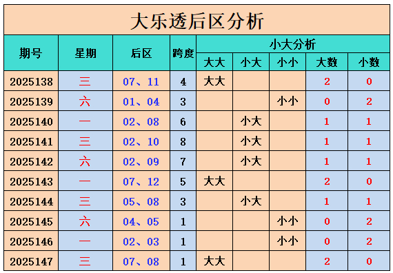 最近10期后区大小比为10:10,最近10期后区大大组合开出3期,小大组合开出4期,小小组合开出3期。上期开出大大组合,本期看好小大组合出现。