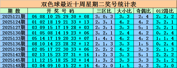 红球周二走势分析(天职析只侧重周二奖号,不触及周日和周四出号): 三区间散布分析:上周二第25148期奖号为:03、04、09、10、15、22+16,区间比为4:2:0。本期热区关心红一区,防三区断区,区间比关心4:2:0。 奇偶分析:上周二第25148期奇偶比为3:3,奇偶红球开出个数格外,本期看好偶数红球大热,关心奇偶比2:4。 龙头分析:上周二第25148期龙头开出03,最近十周星期二龙头奇偶比为6:4,012路比为3:2:5,本期看好龙头下跌,参考号码02。 凤尾分析:上周二第251