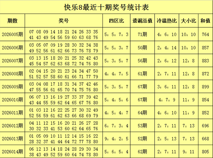 福彩怡悦8第2026014期开奖总结:06 12 13 14 18 24 28 29 30 34 38 43 49 52 59 60 64 74 78 80,其中奖号四区比为5:6:5:4,遗漏总值为62,大小比为9:11,012路比为7:7:6,和值为805。